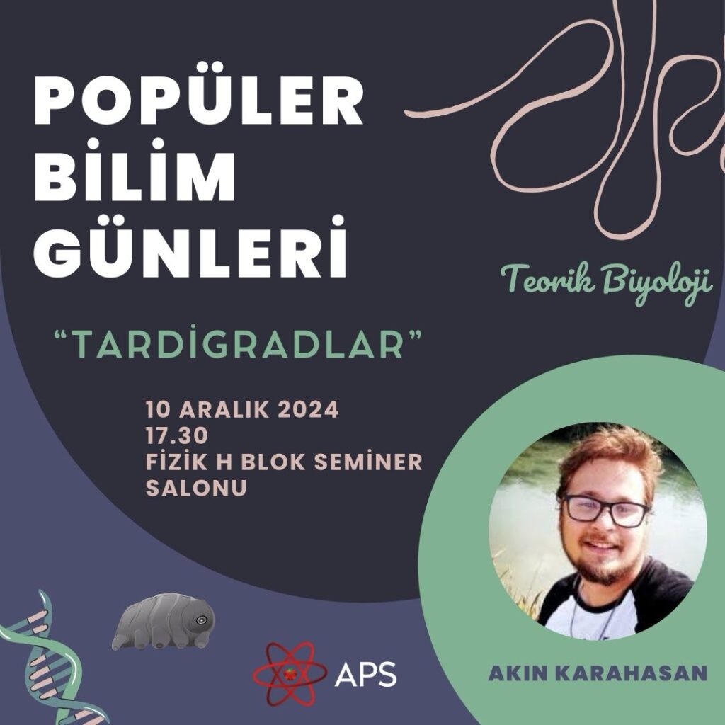 10.12.2024 tarihinde Gebze Teknik Üniversitesi APS Öğrenci Topluluğu Popüler Bilim Buluşmaları kapsamında, tardigradlar üzerine bir konuşma yaptım. Sunumda, bu mikroskobik canlıların morfolojik yapıları, çevresel streslere karşı geliştirdikleri olağanüstü hayatta kalma stratejileri ve kriptobiyoz süreçleri üzerine bilgiler paylaştım. Ayrıca, tardigradların uzay araştırmalarındaki yeri ve astrobiyoloji çalışmalarına sağladıkları bilimsel katkılar hakkında güncel örnekler sundum.