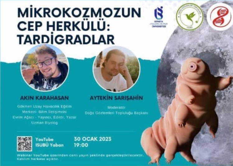30.01.2023 tarihinde Isparta Uygulamalı Bilimler Üniversitesi Doğa Gözlemleri Topluluğu tarafından düzenlenen bir webinar kapsamında, tardigradlar üzerine bir sunum yaptım. Etkinlikte, bu canlıların morfolojik özellikleri, ekstrem koşullara uyum sağlayan kriptobiyoz yetenekleri ve farklı habitatlardaki ekolojik rolleri üzerine bilgiler paylaştım. Ayrıca, tardigradların uzay araştırmalarında model organizma olarak kullanımına ve astrobiyoloji alanındaki bilimsel önemine değindim.