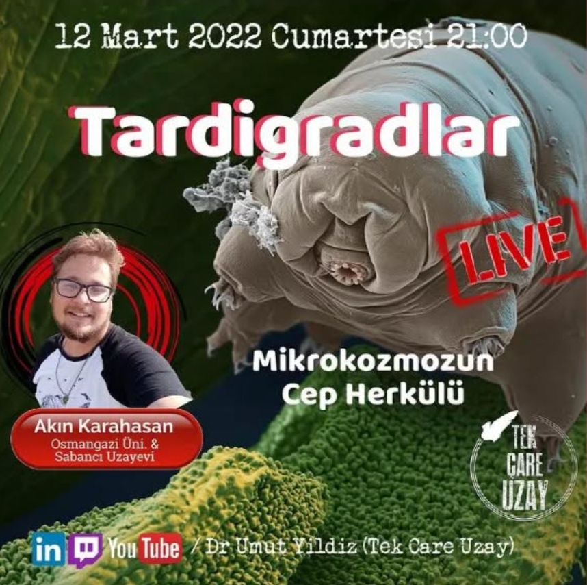 12.03.2022 tarihinde Tek Çare Uzay adlı çevrim içi etkinlikte, NASA’dan Dr. Umut Yıldız ile birlikte tardigradlar üzerine bir söyleşi gerçekleştirdik. Sohbette, tardigradların morfolojik ve fizyolojik özellikleri, ekstrem koşullara uyum sağlayan kriptobiyoz mekanizmaları ve uzay ortamında yapılan deneylerdeki performansları üzerine konuştuk. Ayrıca, bu canlıların astrobiyoloji araştırmalarındaki yeri ve gelecekteki uzay görevleri için sundukları bilimsel potansiyeli değerlendirdik.