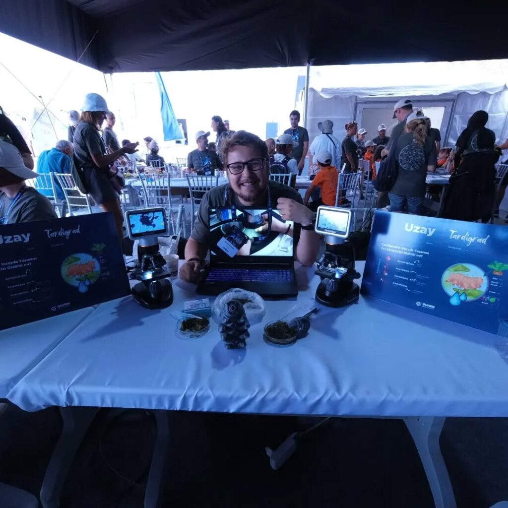 18.08.2022 ile 21.08.2022 tarihlerinde TÜBİTAK Antalya Gökyüzü Gözlem Etkinliği kapsamında, yüzlerce katılımcıya yönelik tardigrad temalı bir atölye gerçekleştirdim. Atölyede, bu mikroskobik canlıların morfolojik özelliklerini, ekstrem koşullara uyum sağlayan kriptobiyoz mekanizmalarını ve ekosistemlerdeki rollerini anlattım. Ayrıca, mikroskop altında tardigrad gözlemleri yaparak katılımcılara bu canlıları doğrudan inceleme fırsatı sundum ve astrobiyoloji araştırmalarındaki önemlerini örneklerle aktardım.